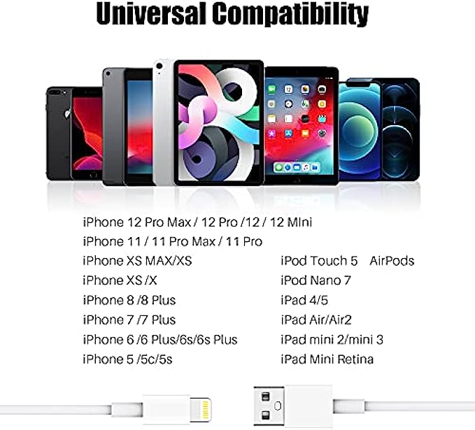 【Massive Compatibility】iPhone Charger Cable for iPhone 13 Pro Max/iPhone 12 Pro Max/12 Mini/12/iphone xr /iphone xs / xs max /iphone x/ iphone 11/iphone11 pro/iphone 11 pro Max, iPhone 8 / 8 Plus, iPhone 7 / 7 Plus, iPhone 6s Plus / 6s / 6 Plus / 6, iPhone 5s / 5c / 5 / SE/iPad Pro/Air/Mini and more.