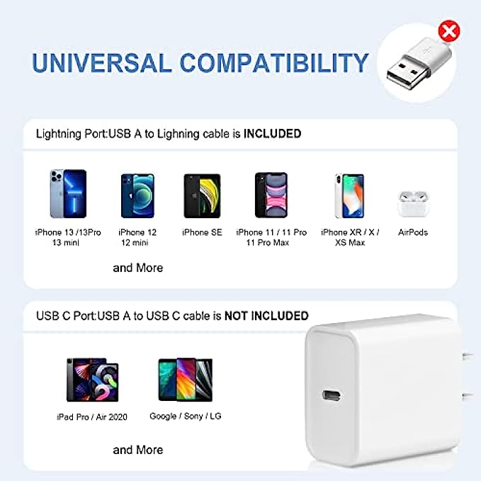 【Universal Compatibility】Wall charger works efficiently with USB-C cords (not included),compatible with iPhone13/13 Mini/13 Pro/13Pro Max/iPhone12/12 Mini/12 Pro/12Pro Max/11/11 Pro/XS/XS Max/XR/X, mini/Air/Pro,Galaxy/S20/S10/S9, Note 20/10/9, etc.