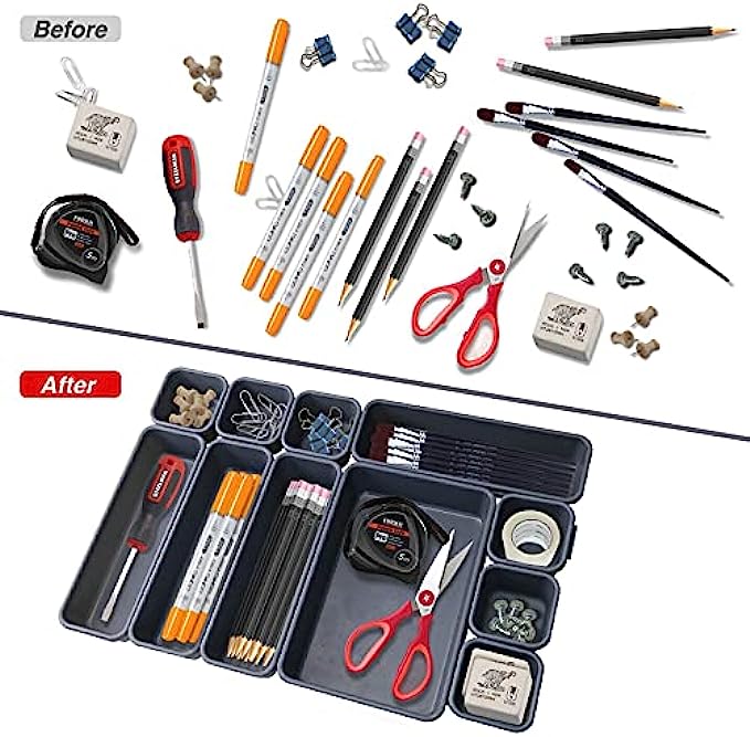 Separate and Stackable - These sturdy desk drawer organizer set can be stacked together, or each one works alone. The interlocking feature of the junk drawer organizer help you create your own mix.Keep everything organized, No more trouble finding things.