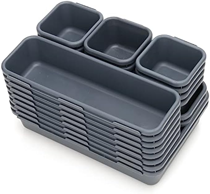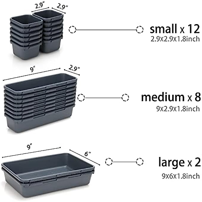 Customize Combination - 22 pack flexible small drawer organizer with 3 various sizes allow for a good variety of layout. Items are organized according to size and use. contains 12pcs Small:(2.9×2.9×1.8 inch) - 7.5×7.5×4.5 cm,8pcs Medium:(9×2.9×1.8 inch)- 23.5×7.5×4.5cm,2pcs Large:(9×6×1.8 inch)-23.5×15.5×4.5cm.