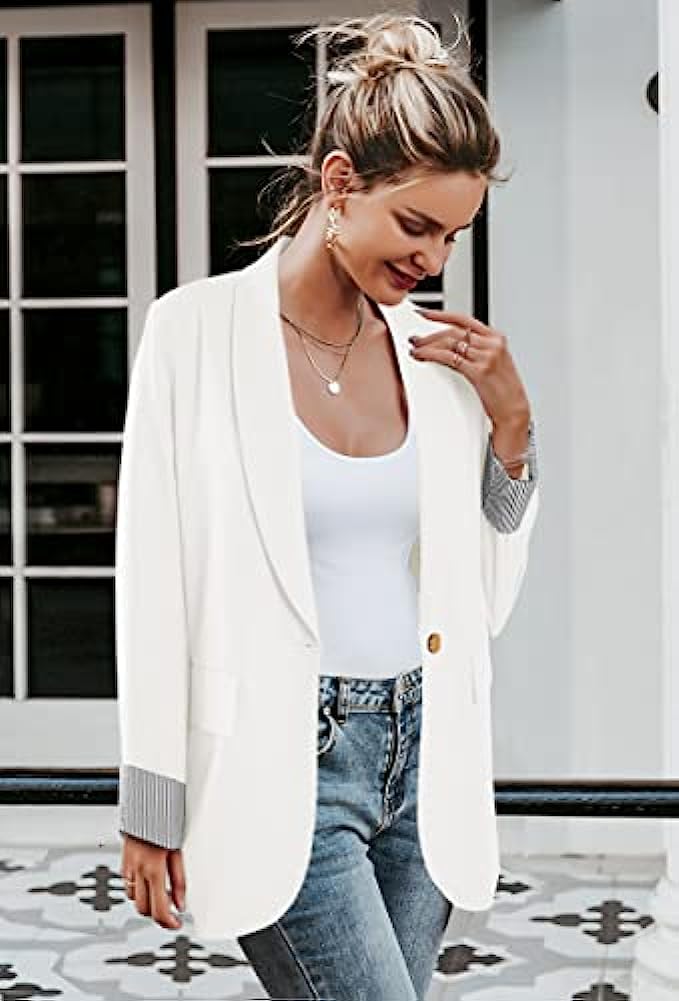 • Design: This is a cute loose fit shawl collar blazer jacket. This classy blazer fits true to size, full lining and has two functional flap pockets, whole solid color with cute striped cuffs and well made , those are easy to creat a professional or casual look! Soft and Comfortable to Wear, Suitable for all seasons especially spring,summer and autumn!