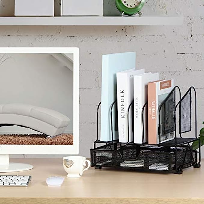 Beiz Desk Organizers and Accessories Storage with Drawer, Paper Tray and 5 Vertical File Folder Holders to Collect Office Supplies, Desktop Organizer for Workspace Home Office School, Black