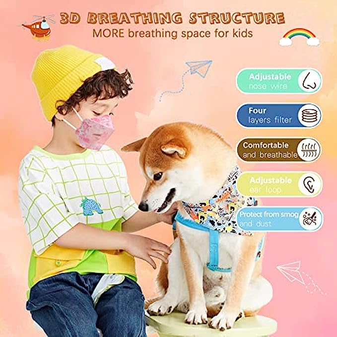 Ear Loop closure 【Exclusive Design】: The KF94 fish mouth design can form a perfect wrap from the chin to the bridge of the nose without leaving a gap. At the same time, it can prevent the mouth from contacting the mask, which increases the safety level and has the best wearing feeling. 【Product Introduction】: kids disposable face masks,The folding specification is :17*7CM, the unfolding is :17*15 CM, four layers of protection, can be close to the face, get the best protection effect, the ear hook is 6CM, the longest stretch is 18CM, and the elasticity is excellent. 【Four-layer Material】: the outermost layer is made of printed non-woven fabric, and the middle layer is made of two layers of melt-blown fabric, which can effectively prevent PM2.5 and protects up to 95%. The last layer is made of skin-friendly non-woven fabric, which fits the face without hurting the skin . 【Strong air Permeability】: Because the fish mouth shape design reserves a larger breathing space, a part of the air is reserved in the empty slot. This design will have better air permeability than ordinary masks and easier to breathe. Glasses will not be so Foggy. 【You Will Get】: 6 patterns, each 10 pieces individually packaged, a total of 6 packs (60 pieces)