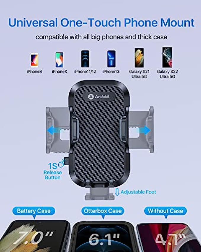 [Adjustable Foot Design, Universal Compatibility ] - Andobil product manager designed adjustable foot of car phone holders. Avoid some cell phone power or volume button will be squeezed by the clamp arm. Meanwhile, the adjust foot improve the compatibility making this car cell phone holder fit for all smartphones. BTW, You don't need to remove your thick case while using this phone holder car. - Big Phones & Thick Case Friendly